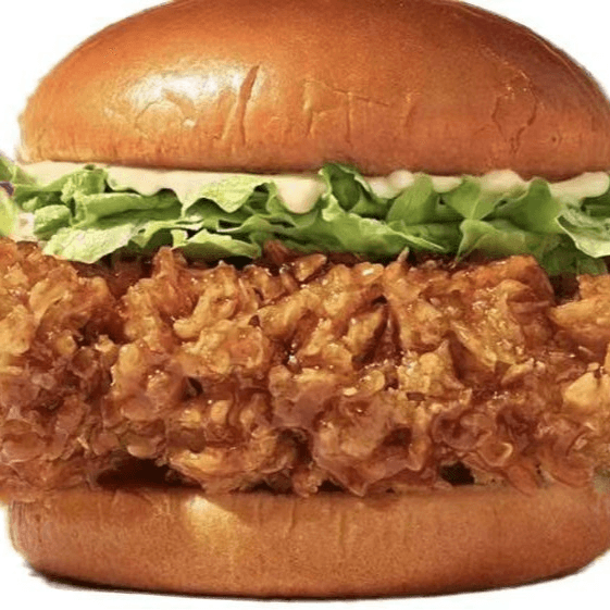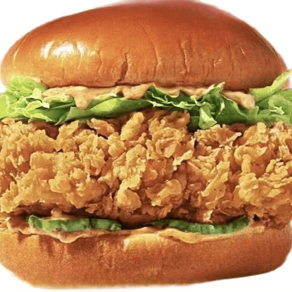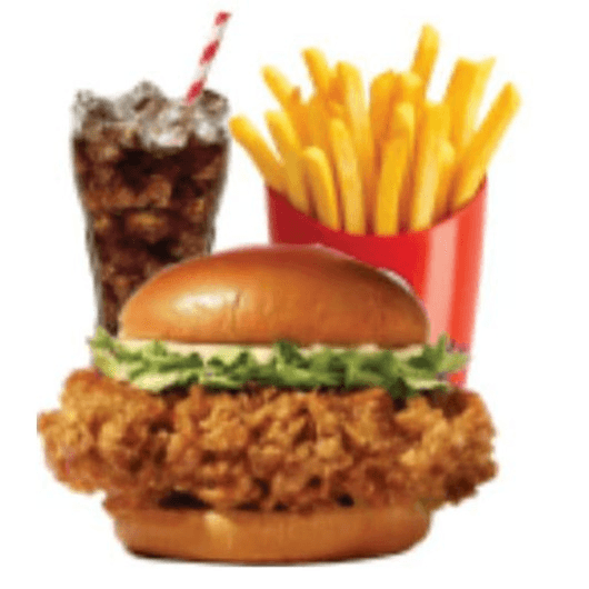 A spicy, crispy seasoned chicken patty, layered with crisp lettuce, ripe tomatoes, and house spicy mayo, served on a butter-toasted brioche bun. Comes with golden fries and a freshing soda.