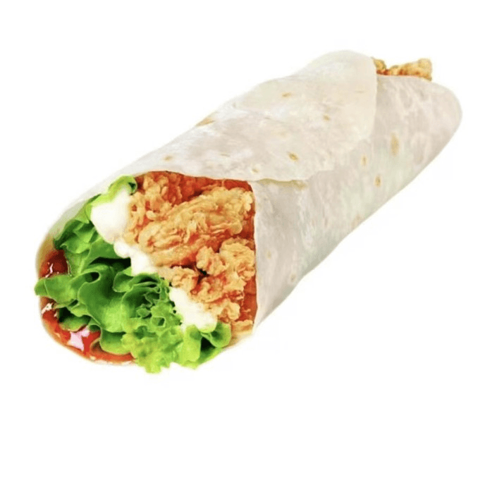 A spicy seasoned chicken breast paired with crisp lettuce, ripe tomatoes, and house spicy mayo, all wrapped in a soft 8-inch tortilla.