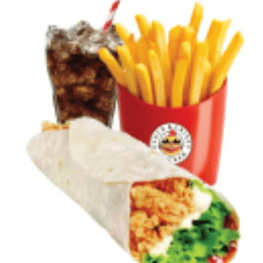A spicy seasoned chicken breast paired with crisp lettuce, ripe tomatoes, and house spicy mayo, all wrapped in a soft 8-inch tortilla. Comes with golden fries and a refreshing soda