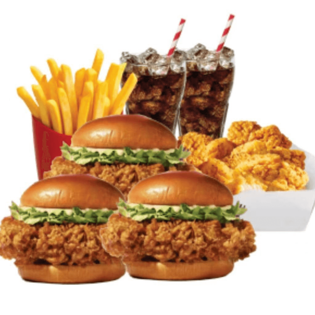 Perfect for sharing! Includes 3 crispy chicken sandwiches, spicy or not, 1 popcorn chicken, 1 order of golden French fries, and 2 refreshing sodas.