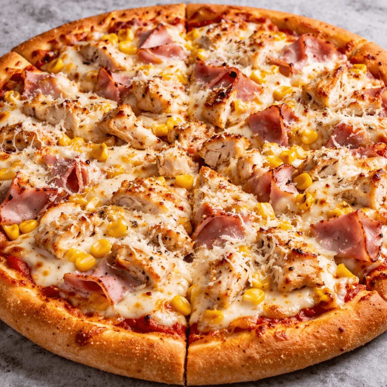 Grilled chicken, baked ham, corn, topped with extra mozzarella & parmesan