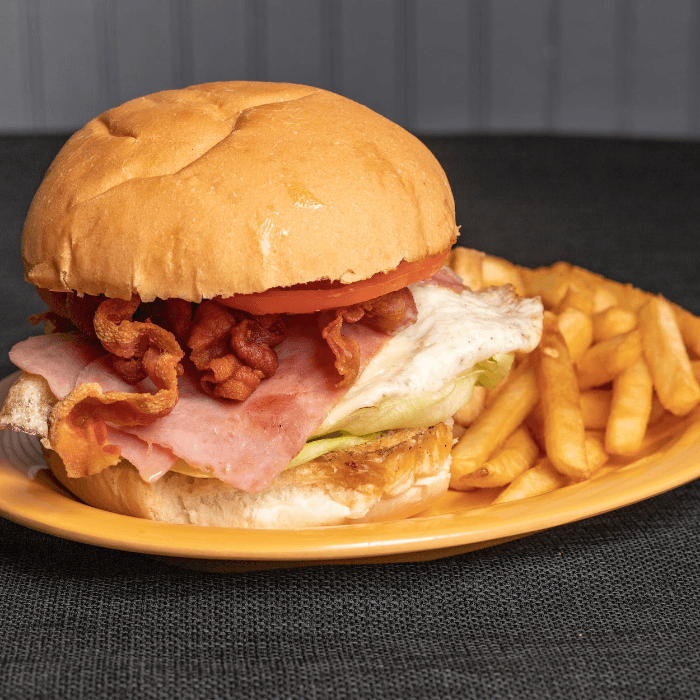 Grilled chicken breast, cheese, bacon, egg, ham, and corn. Served with fries