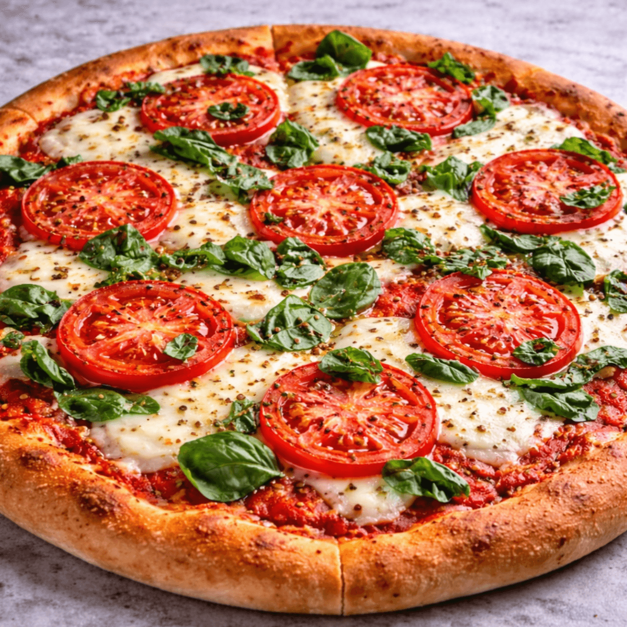 Fresh spinach, marinated chicken breast, pepperoni, fresh basil, topped with our homemade roasted red peppers