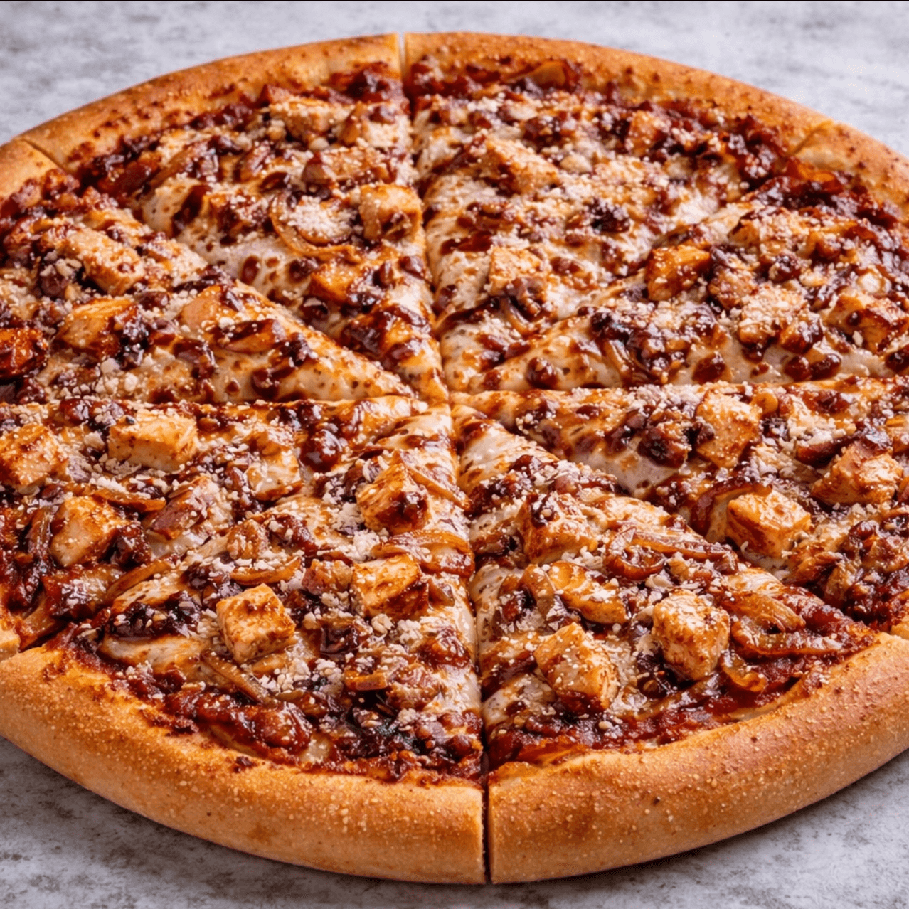 BBQ grilled chicken topped with caramelized onions, mozzarella & parmesan